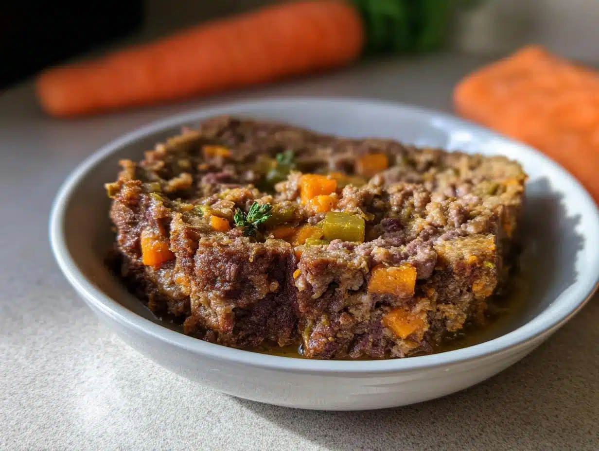 A slice of homemade beef and vegetable roll for dog, topped with visible carrot chunks, served in a light bowl.