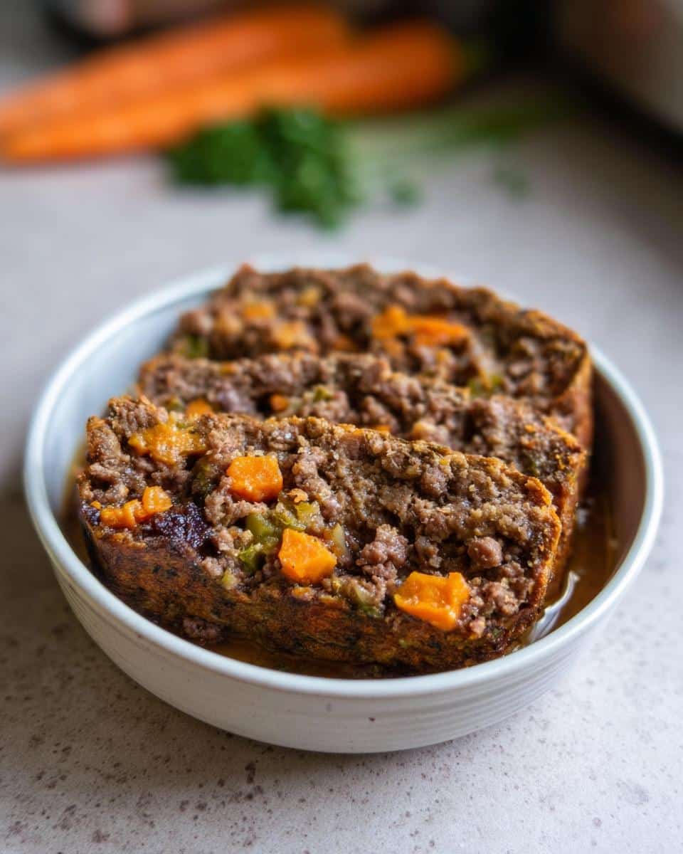 A thick slice of homemade beef and vegetable roll for dog served in a small bowl, with carrots visible in the background.