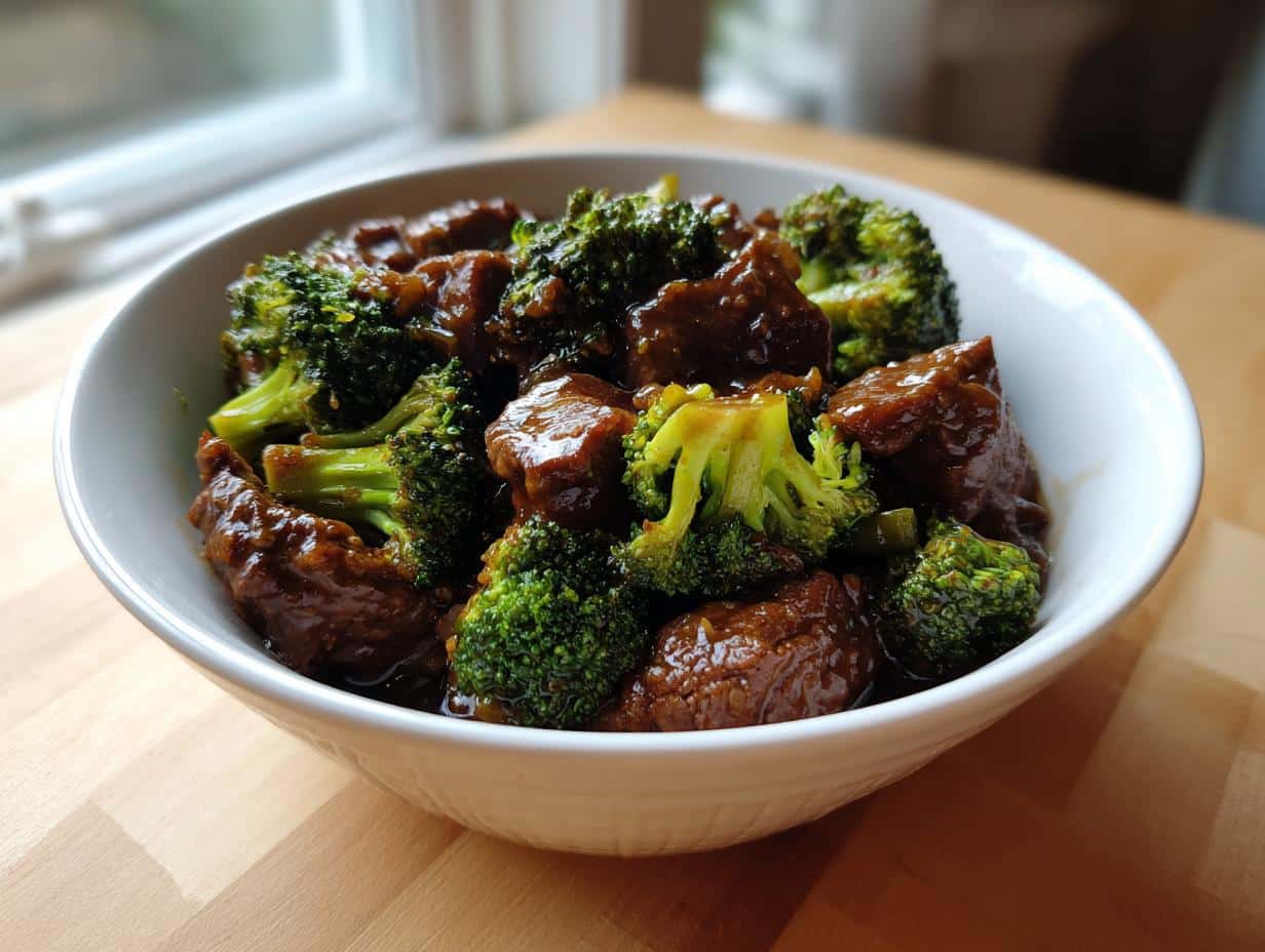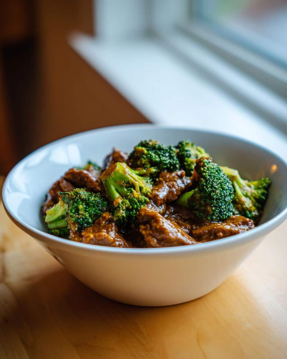 Close-up of tender chunks of beef and bright green broccoli florets coated in a rich brown sauce, served in a white bowl.