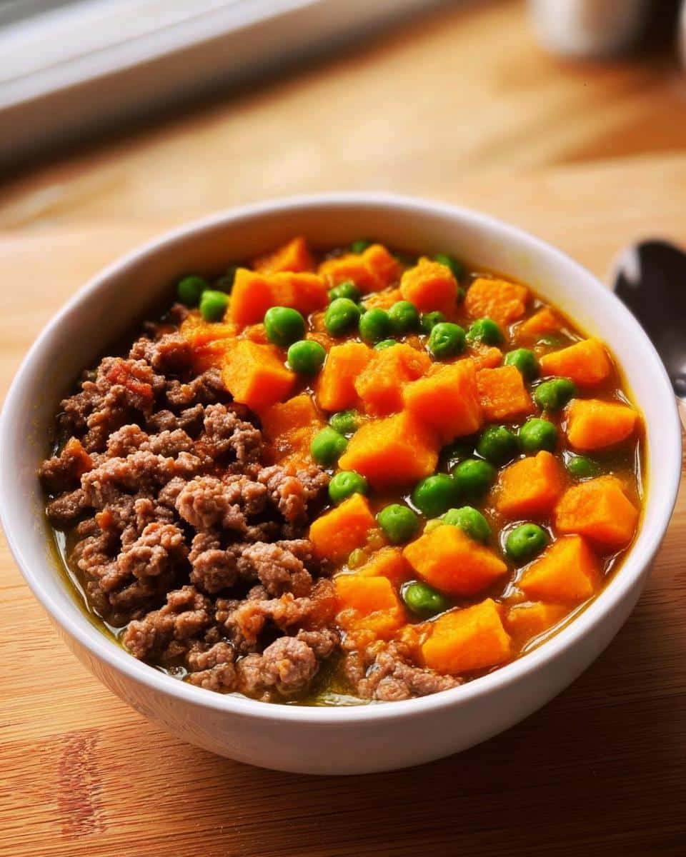 You’ll need your sweet potatoes peeled and diced—dice them small so they cook down nicely and get super tender. We’re tossing in some carrots and green peas for extra vitamins and color. Don’t forget the water to create a nice broth when cooking, and a little olive oil right at the end for those essential healthy fats. For a super nutritious meal plan, check out the details on Beef Sweet Potato Vitamin Rich Dog Food.