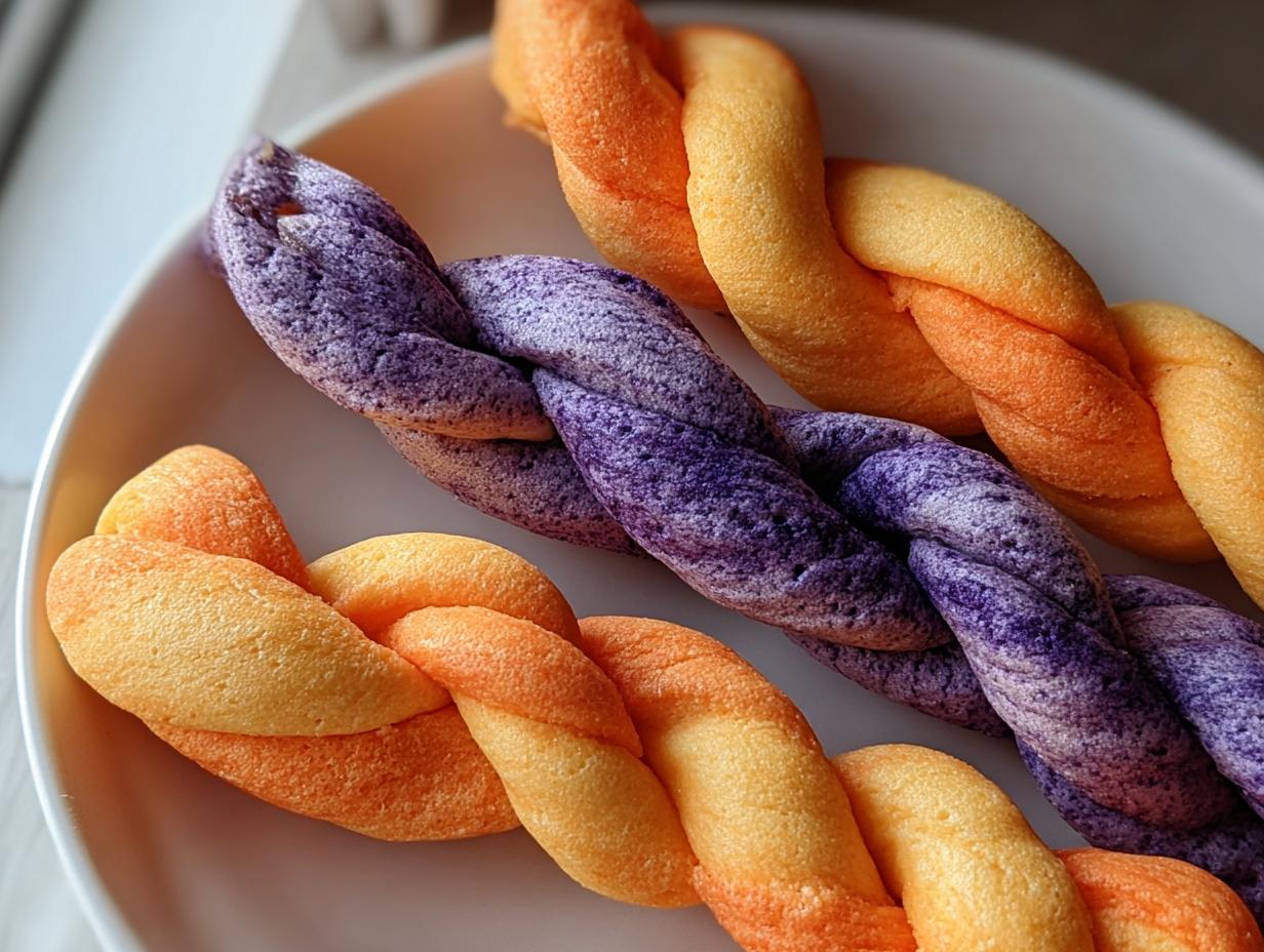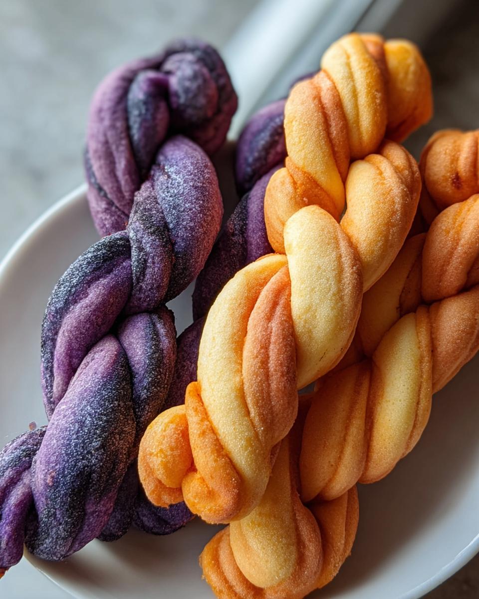 Time to twist! Roll out small strips of both the orange and purple doughs. Now, lay one strip of each color side-by-side and gently twist them together securely. You can even braid them if you want something fancier than a twist! Place them on your baking sheet. Remember to preheat your oven to 350ยฐF (175ยฐC). Bake these beauties for about 25 to 30 minutes until they feel nice and firm. Let them cool completely on a wire rackโ€”they get a little fragile when hot, so be patient. If you hate sticking, you can always check out tips on using silicone molds for foolproof releases next time!