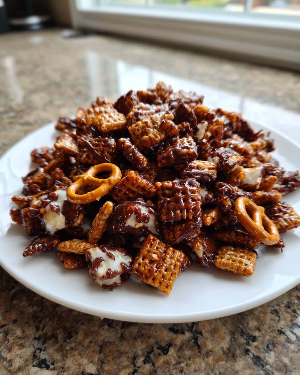 - Place the Crispix cereal, pretzels, nuts, and marshmallows in a very large bowl. Set aside.