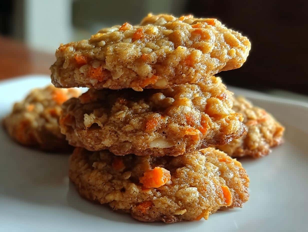 A stack of freshly baked Carrot & Apple Crunchy Cookies with visible orange carrot pieces.