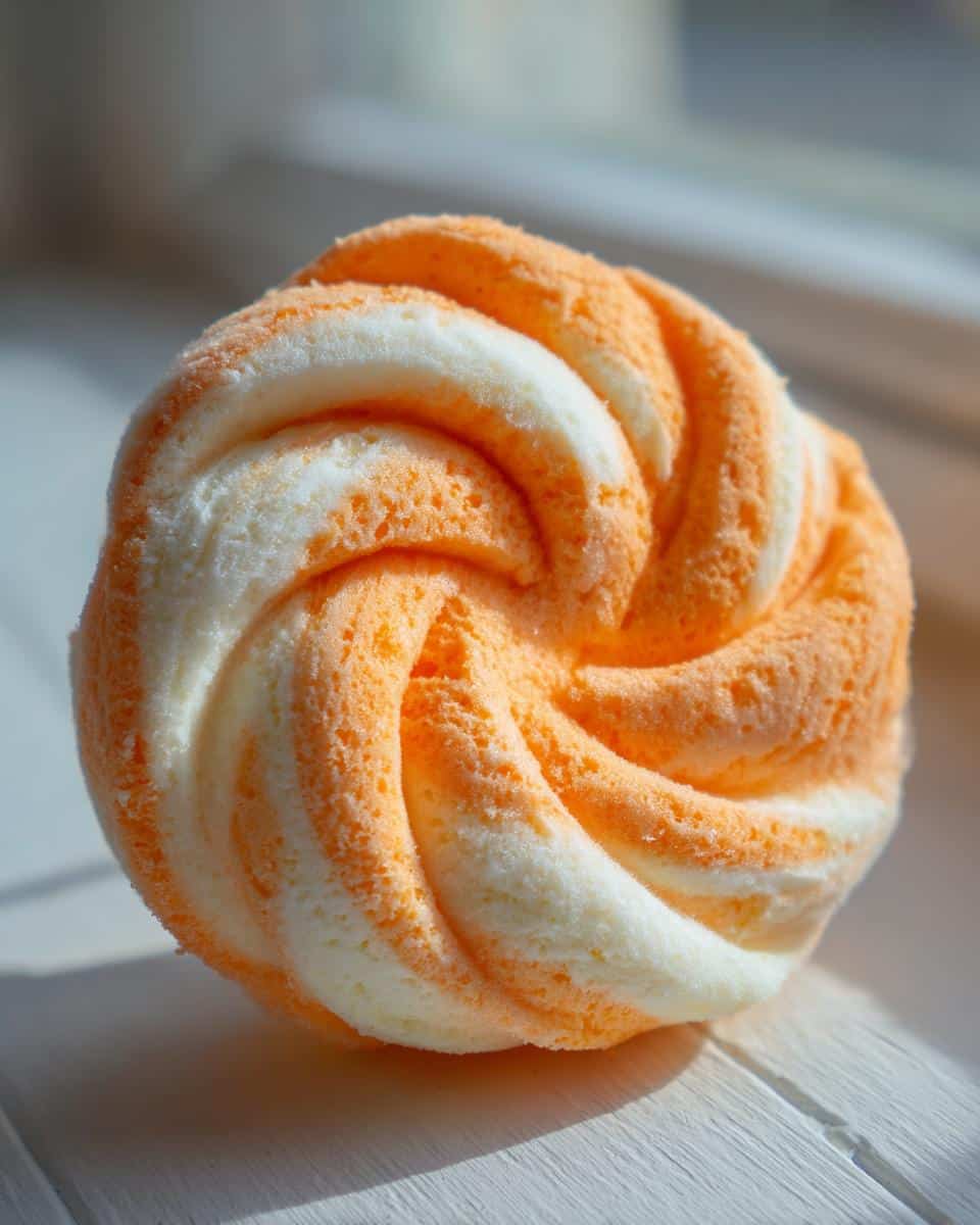 Close-up of a swirled, frozen treat resembling a bone shape, featuring orange and white layers, like Carrot Apple Frozen Swirl Bones.