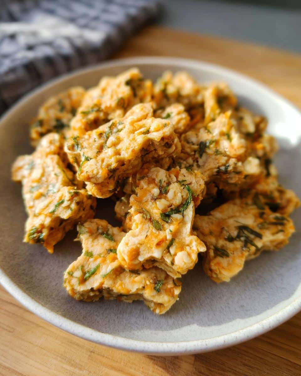 Trust me, these Cheesy Herb Baked Dog Treats are the answer: crunchy, savory, and totally poultry-free. Theyโre so easy, youโll make a huge batch!