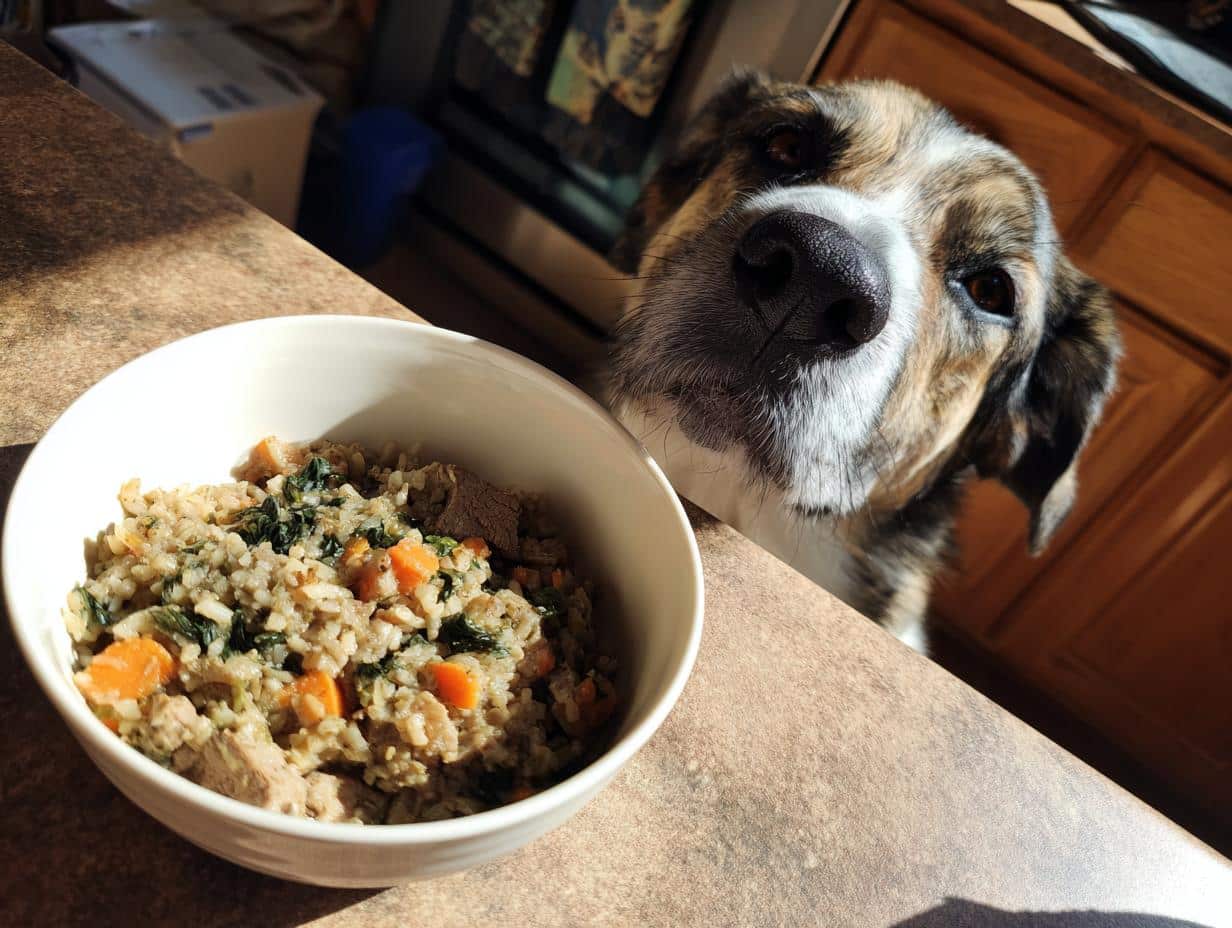 A dog looks longingly at a bowl of Chicken Liver & Spinach Large Dog Meal.