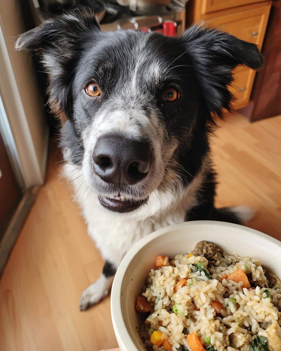 A border collie looks eagerly at a bowl of Chicken Liver & Spinach Large Dog Meal.