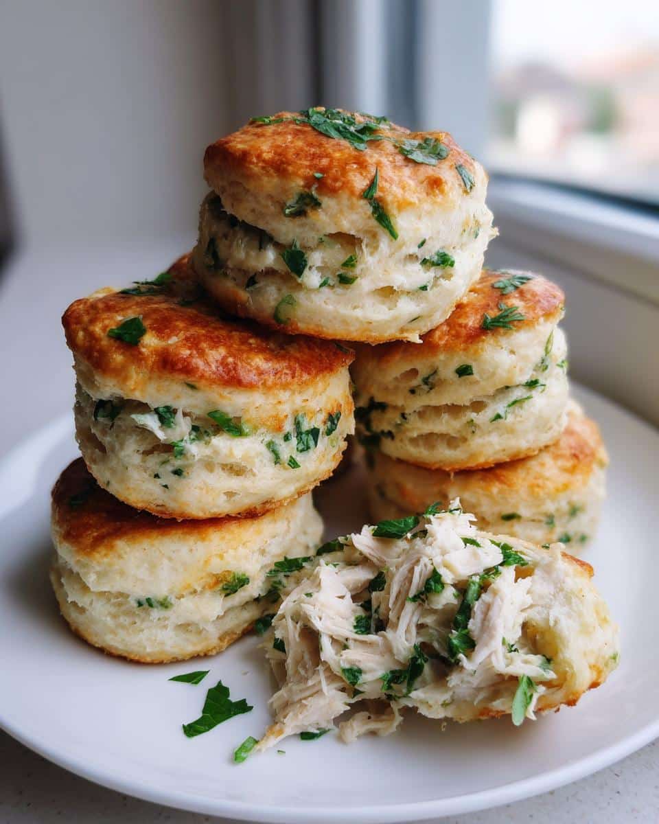 A stack of golden-brown Chicken & Parsley Biscuits, one broken open to show shredded chicken filling.
