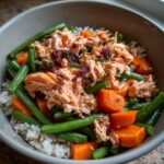 A bowl of Crockpot Salmon & Veggie Dog Dinner, featuring salmon, green beans, carrots, and rice.