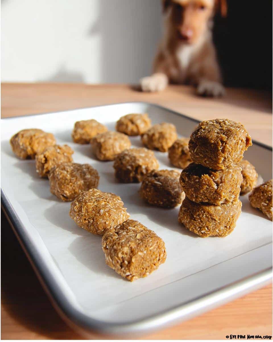 Now, take that lovely, thick dough out of the processor. You’ll want to work it on a clean surface that youโve dusted lightly. Use some of those extra ground oats you reserved, or maybe a bit of plain whole wheat flour if you have it, to stop it from sticking to your hands and counter. Roll the Dog Pumpkin Peanut Butter dough out until itโs about a quarter-inch thick. You can use a little cookie cutter (super cute shapes work best!) or just take a knife or pizza cutter and slice it into small squares. Squares are fasterโand let’s be honest, Buster doesn’t care about aesthetics!