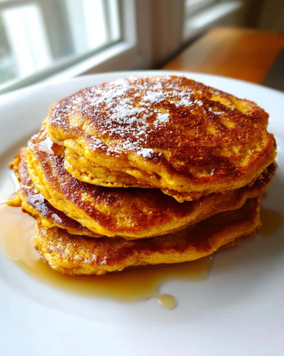 A stack of three golden-brown Egg & Pumpkin Pancakes dusted with powdered sugar and drizzled with maple syrup.