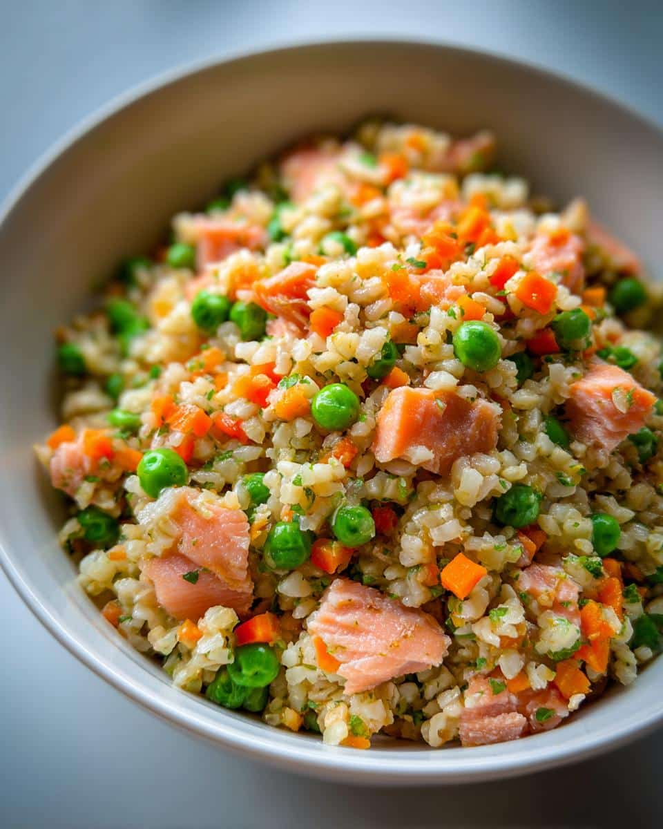 Bowl of Fresh Salmon & Green Pea Immune Dog Food, featuring rice, salmon chunks, and green peas.
