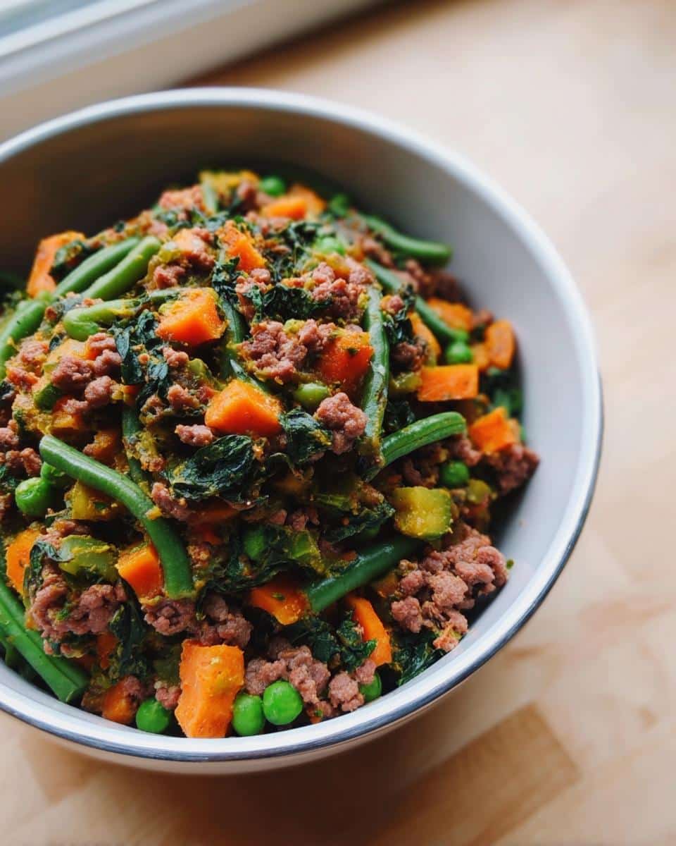 Close-up of a bowl containing Grain-Free Beef and Lamb Dog Food Recipe mix with ground meat, carrots, spinach, and green beans.