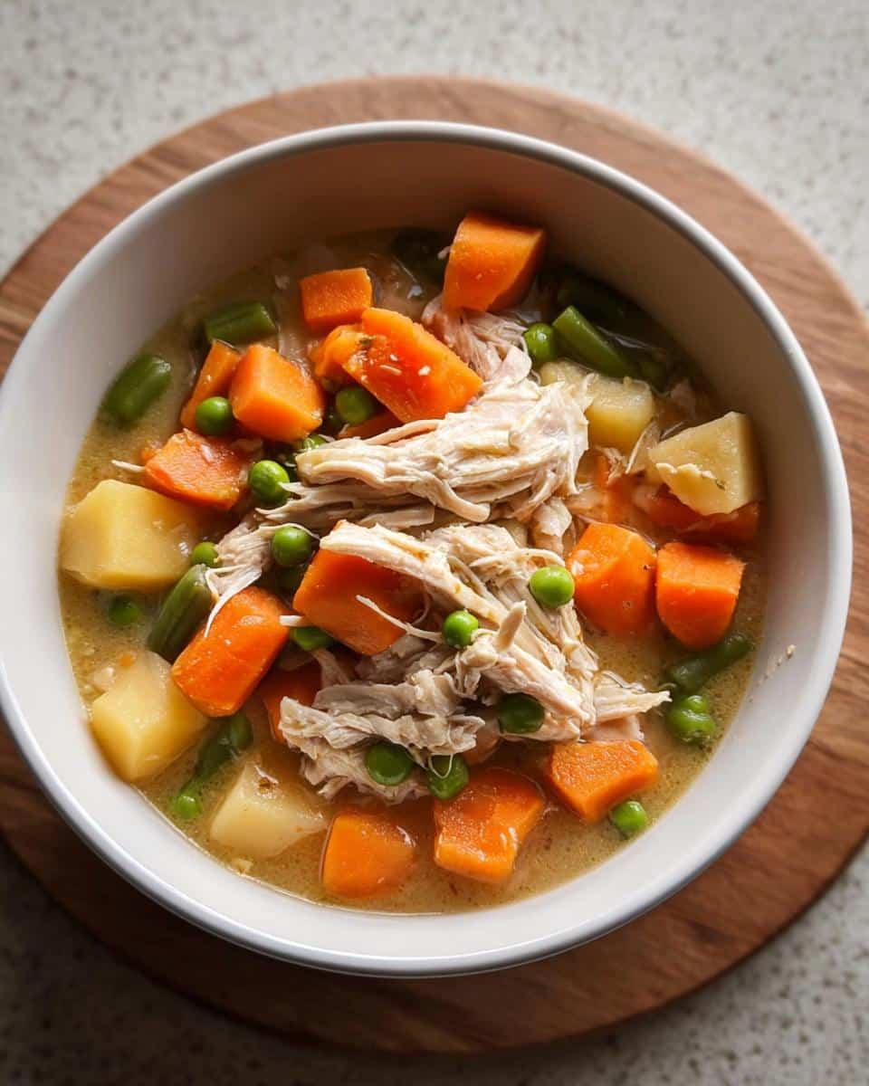 While the chicken rests, toss all those chopped veggiesโ€”the carrots, diced sweet potatoes, green beans, and peasโ€”right back into that same pot, using the broth that the chicken just cooked in. That broth is now full of flavor! Let them simmer for another 10 to 15 minutes. Now, hereโ€™s the texture tip: we want them tender, but not totally mushy. They need a little bite left in them so they don’t dissolve completely during the long Crockpot phase later on.