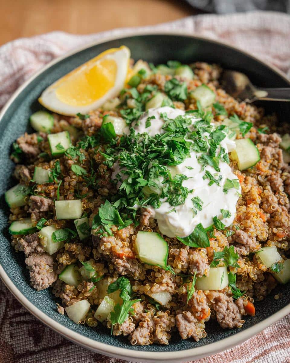 4. In a large mixing bowl, combine the cooked lamb, quinoa, cucumber, and parsley. Serve with Greek yogurt on top.