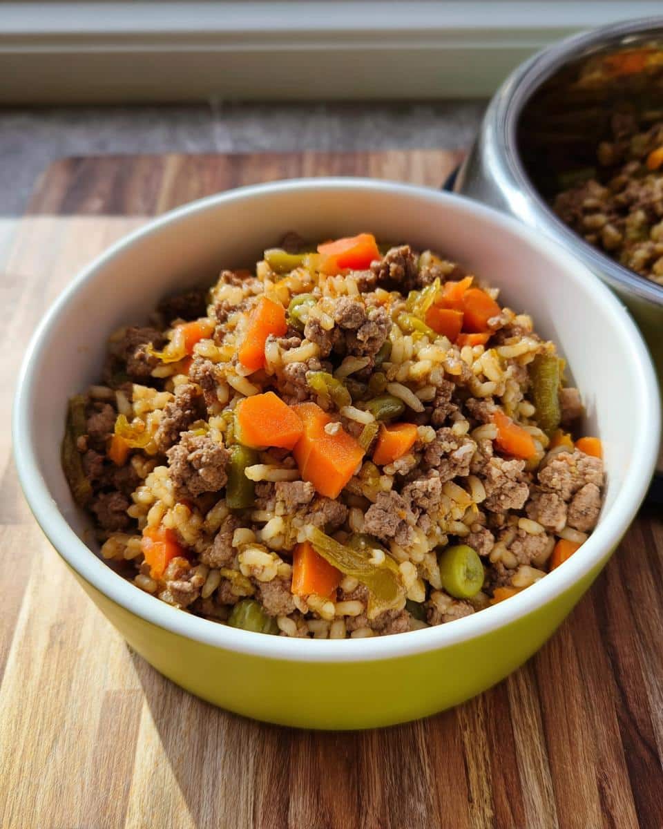 Close-up of a bowl filled with homemade Lamb & Rice Mini-Batch Dog Food, featuring ground lamb, rice, carrots, and green beans.