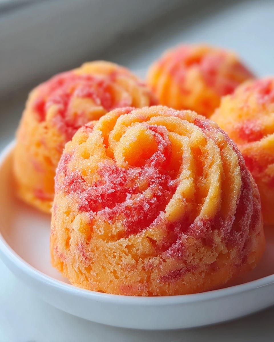 Close-up of frozen, scooped Mango and Strawberry Swirl Frozen Dog Treats showing icy texture.