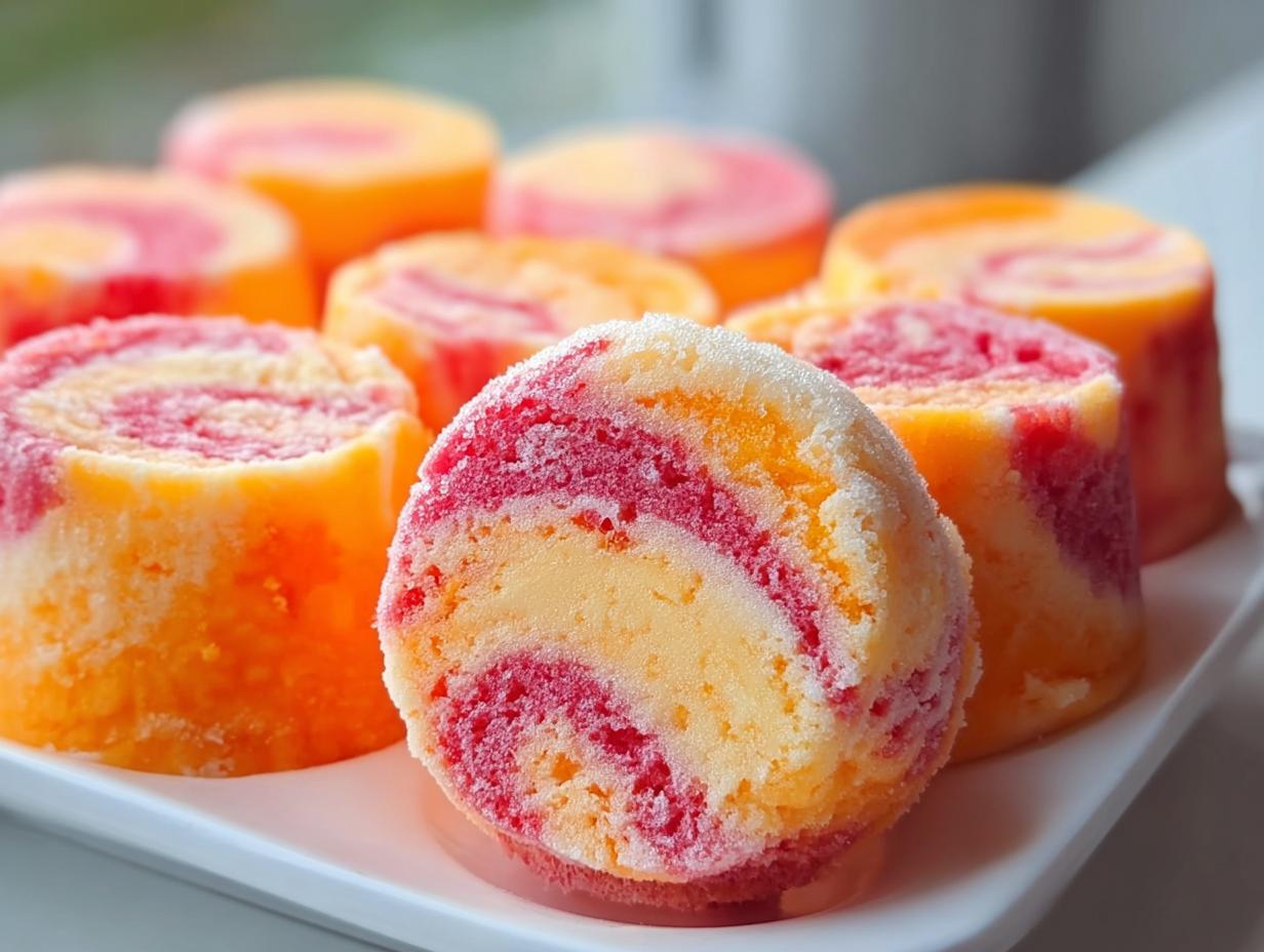 Close-up of several Mango and Strawberry Swirl Frozen Dog Treats showing the vibrant pink and orange swirl pattern.