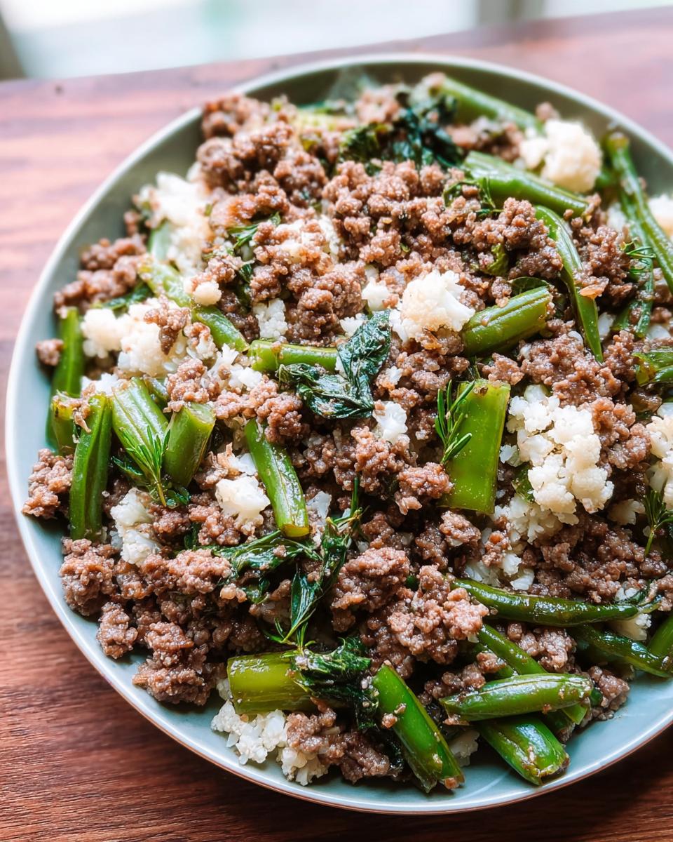 Once the meat is looking perfectโbrowned and crumblyโitโs time for the good stuff! Toss in the cauliflower rice, the chopped bok choy, your green beans, and that teaspoon of dried rosemary. Give everything a good stir right away. You want to make sure that rosemary gets mixed everywhere and the vegetables start hitting that warm meat fat so they soften up just a tiny bit. Youโre basically creating a colorful, nutrient-dense landscape in that pan for your March Beef, Brown Rice & Cauliflower Dog Food.