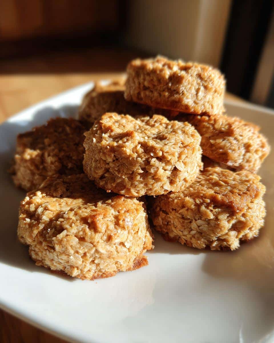 A small stack of round No-Bake Peanut Butter Dog Treats made with oats, sitting on a white plate.