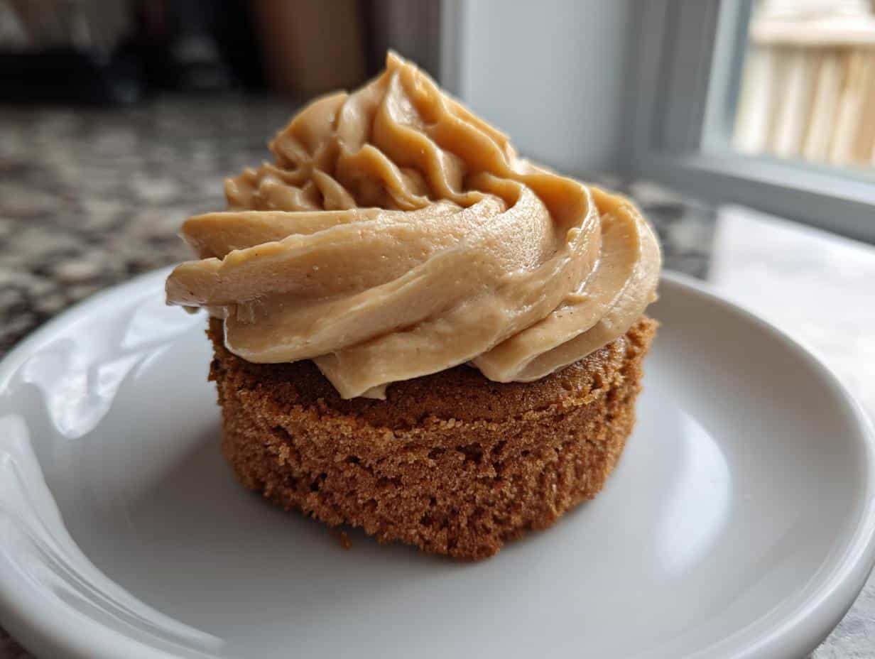 A close-up of a freshly baked Peanut Butter Frosted Pupcake topped with a swirl of creamy frosting, sitting on a white plate.