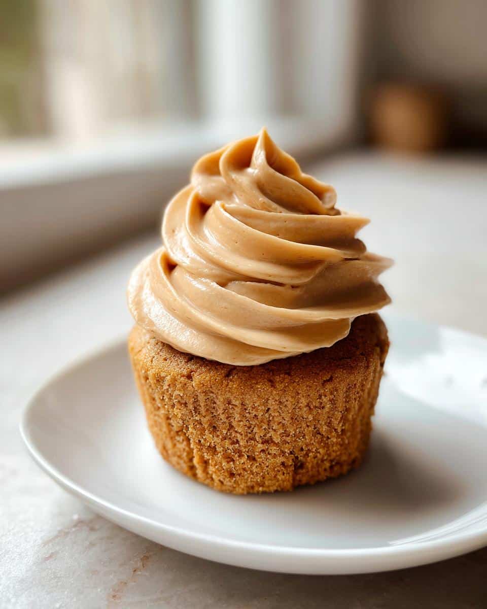 A single, golden-brown pupcake topped with a tall swirl of creamy Peanut Butter Frosted Pupcake frosting, sitting on a white dish.