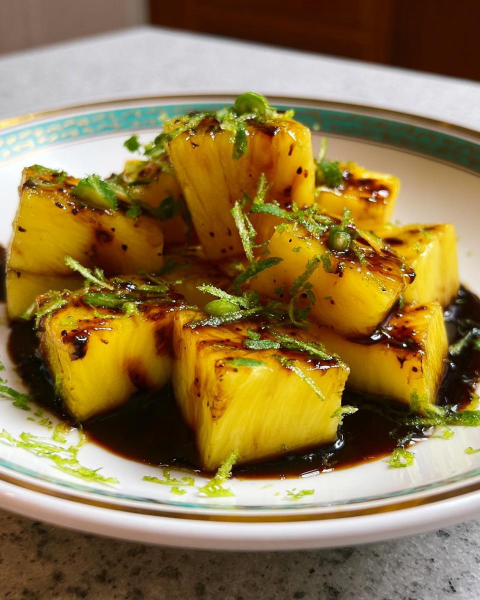 Now for the fun part! Arrange those beautiful pineapple chunks attractively on your serving platesโpresentation always matters, even for a 10-minute dessert. Zest your lime right over the top; make sure you get that vibrant green zest, not the bitter white pith underneath. Chop that zest up slightly, sprinkle it over everything, and then grab your spoon. Drizzle that rich river of molasses over the fruit and zest. That final touch of dark **Pineapple and Molasses** is what makes this combination sing. Serve it right away while everything is perfectly fresh!
