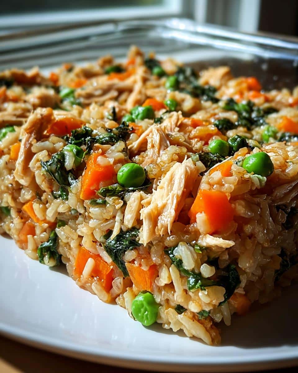 Once your veggies and rice are mingled, gently fold in that shredded, unseasoned chicken breast. Now comes the brothโslowly pour in your 2 cups of onion and garlic-free, low-sodium chicken broth. Mix it all together gently until everything looks soaked and happy. Donโt over-mix; we just want it combined!