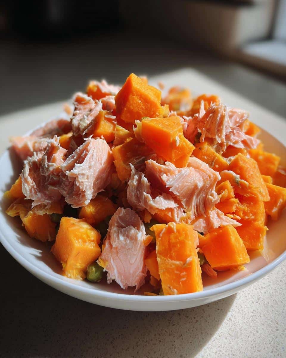 Now, flake that gorgeous salmon right there in the bowl. A close-up of flaked salmon mixed with bright orange chunks of sweet potato, part of the Salmon & Sweet Potato Stars recipe.Once the sweet potatoes are soft, pull them out of the oven and add them straight into the bowl with your flaked fish. If youโ€™re using those optional frozen peas, toss them in now too! Gently mix everything together. Remember, we arenโ€™t mashing it into a paste; we want some texture. Find more cooking methods in this guide. Crucially, you must let the whole mixture cool down completely before you portion it out or serve any to your dog. This batch gives you about 7 solid meals of homemade salmon dog food!