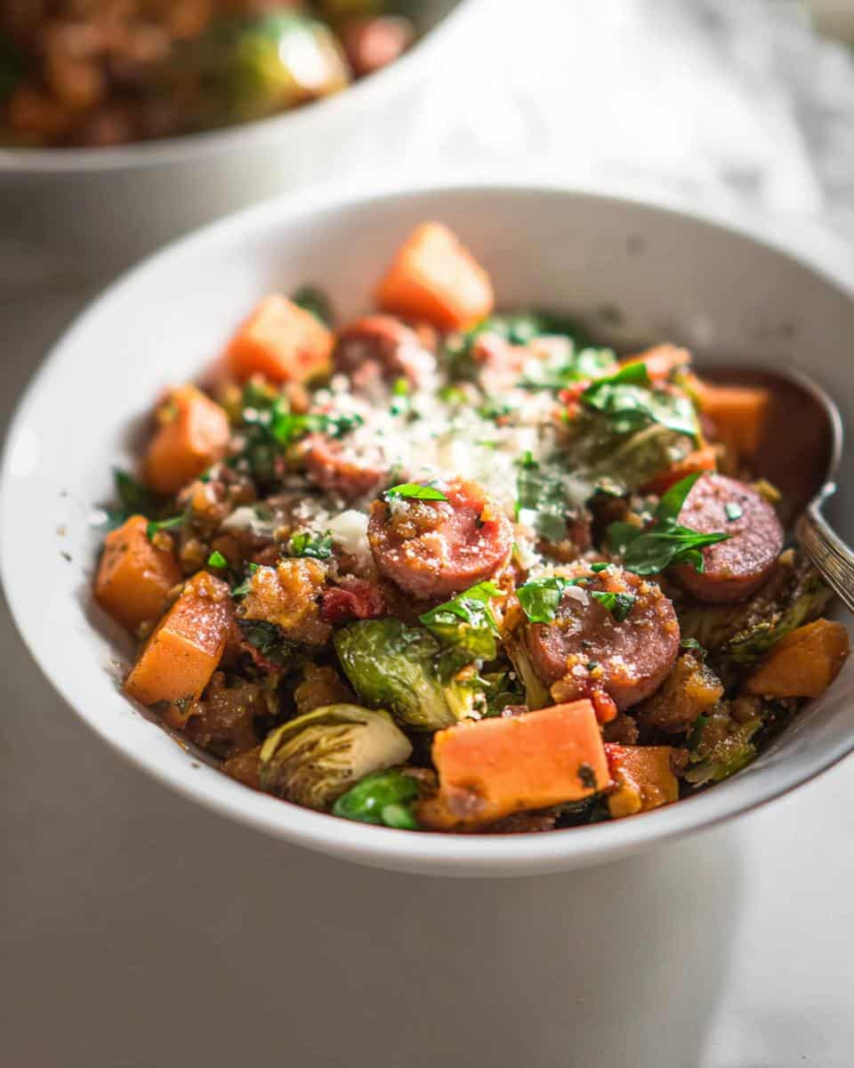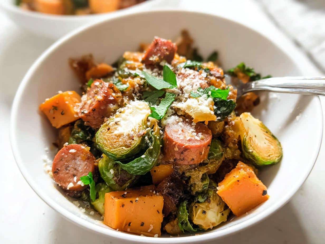 - Put the sweet potato and Brussels sprouts mixture into bowls and top each serving with one sliced sausage.