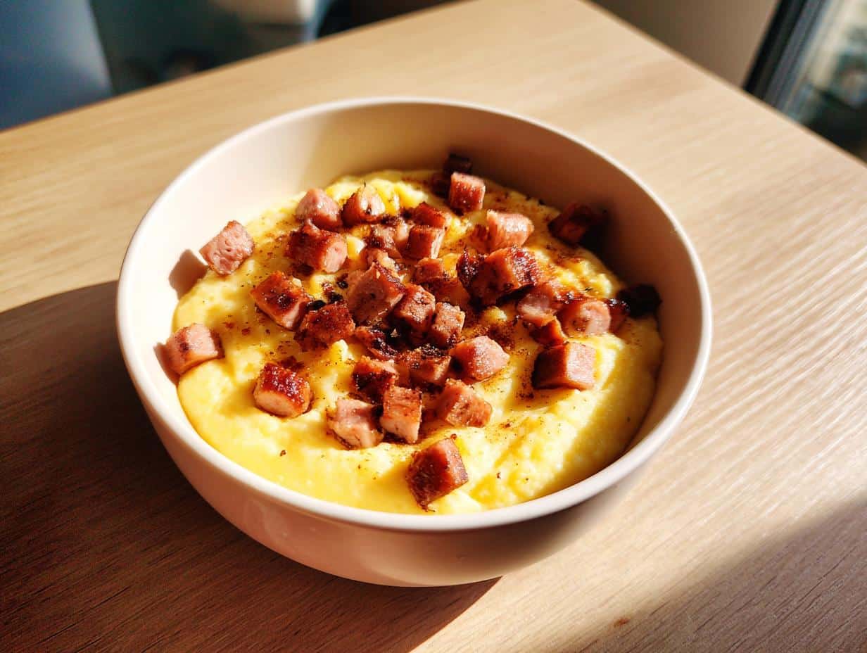 A bowl of creamy Soft Polenta Cheese Dog Breakfast topped with diced sausage pieces.