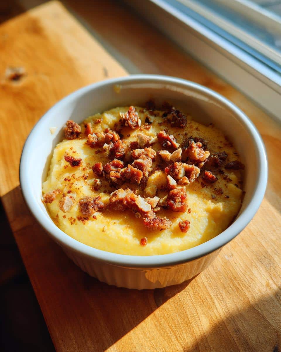 A bowl of creamy yellow Soft Polenta Cheese Dog Breakfast topped with savory crumbles, sitting on wood.