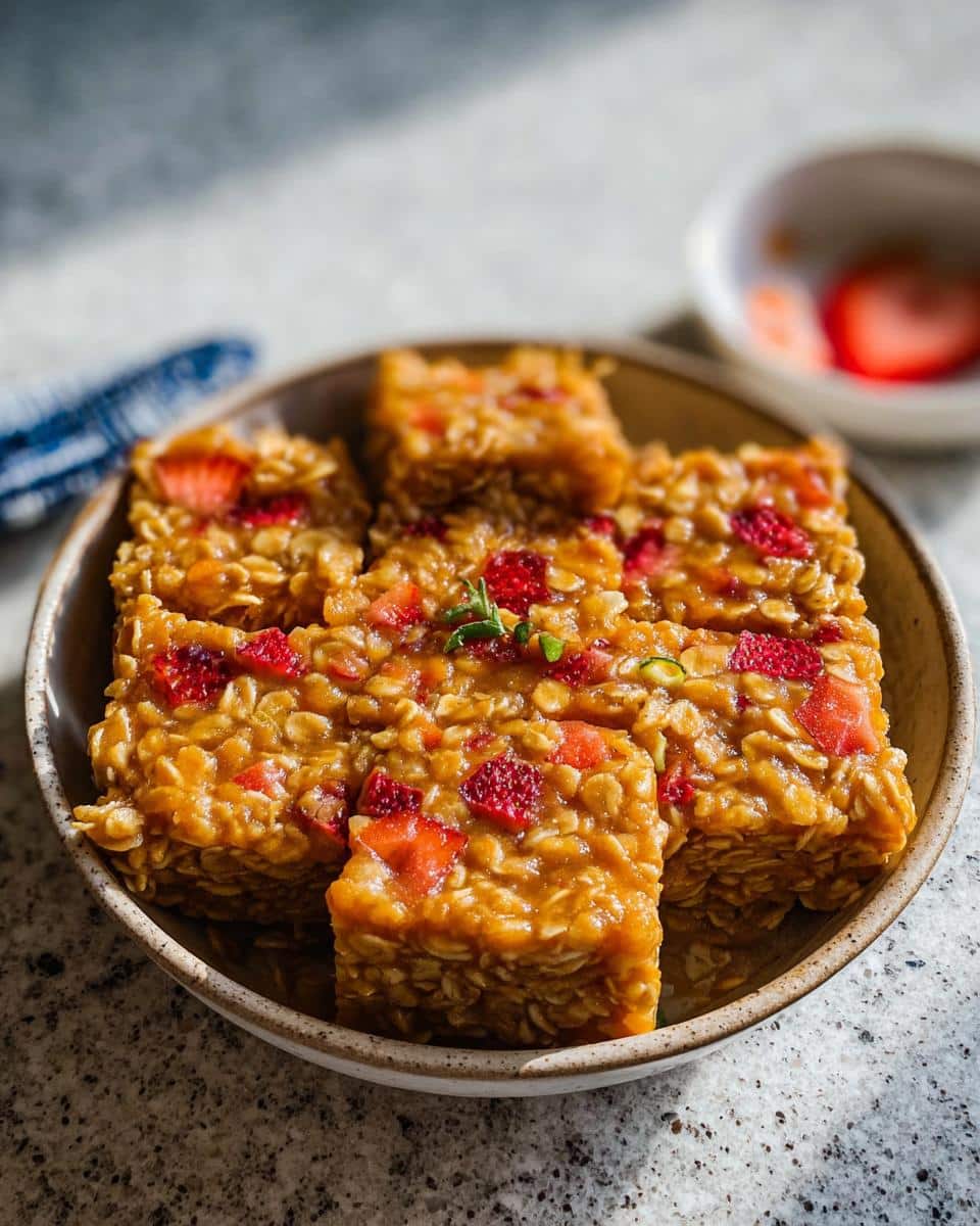These oat nibbles feature fresh strawberries and are simple to prepare.