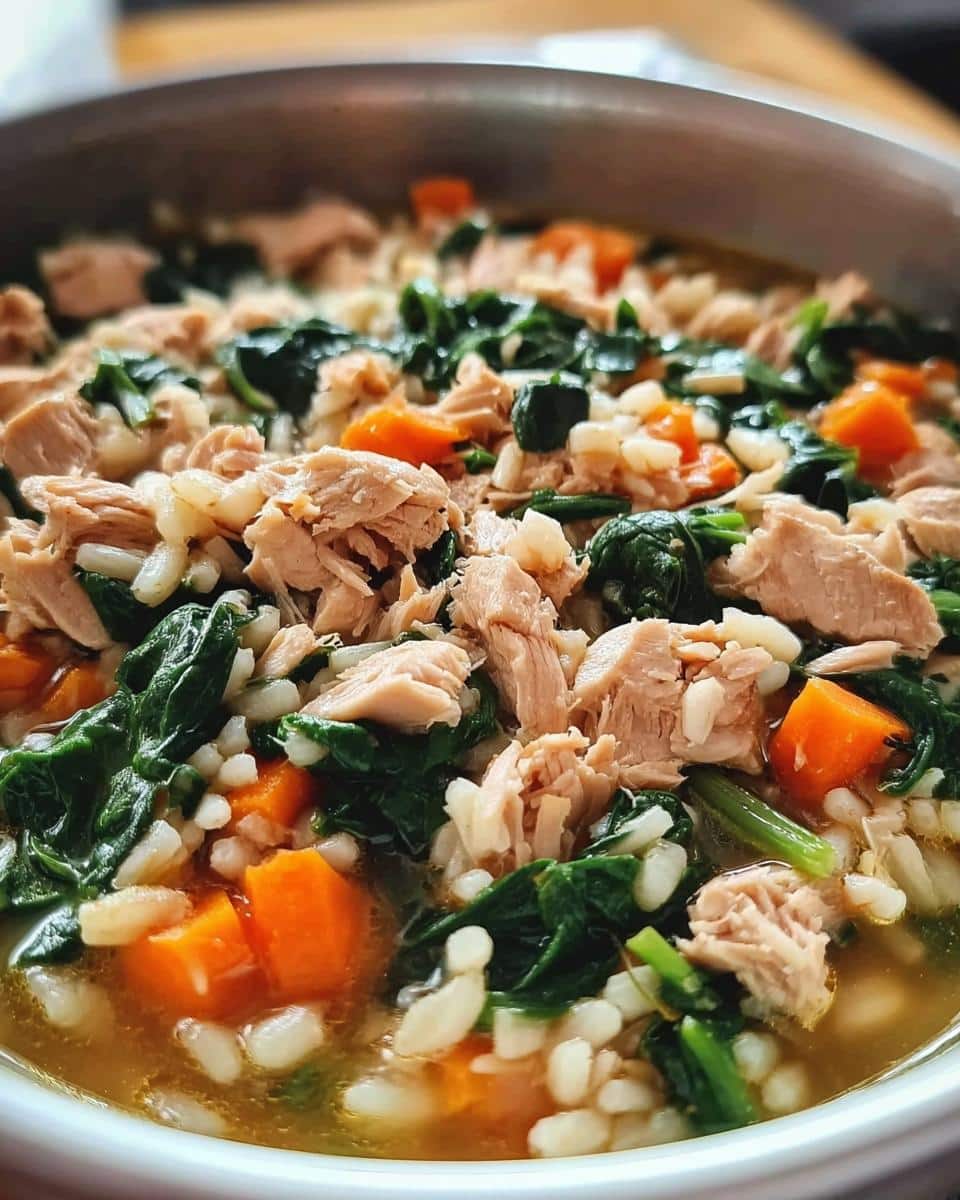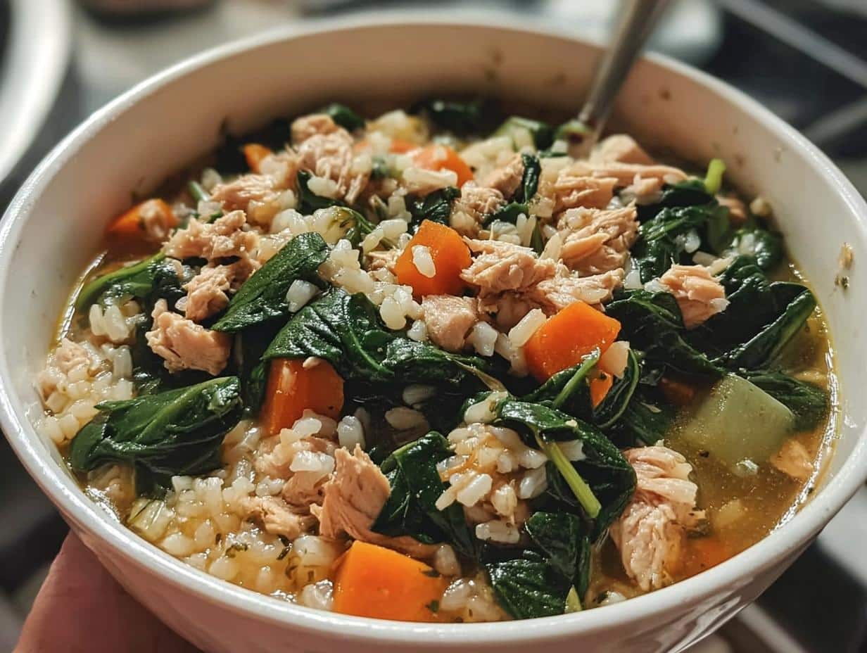Close-up of a hearty bowl of Tuna & Spinach Stew featuring flaked tuna, wilted spinach, diced carrots, and rice in broth.