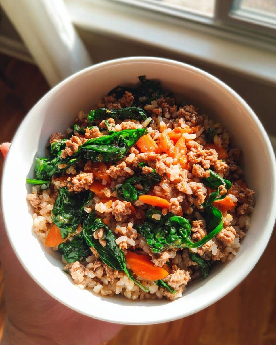 - In a bowl, combine the cooked meats, brown rice, carrots, and spinach.
