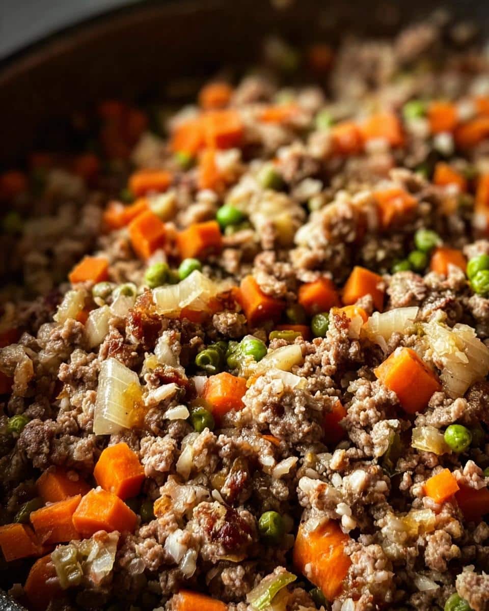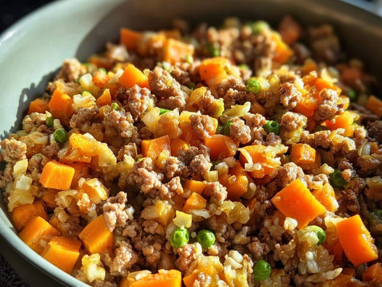 Close-up of a hearty Turkey Liver & Oatmeal Carrot Dog Food Recipe, showing ground turkey, diced carrots, peas, and oatmeal.