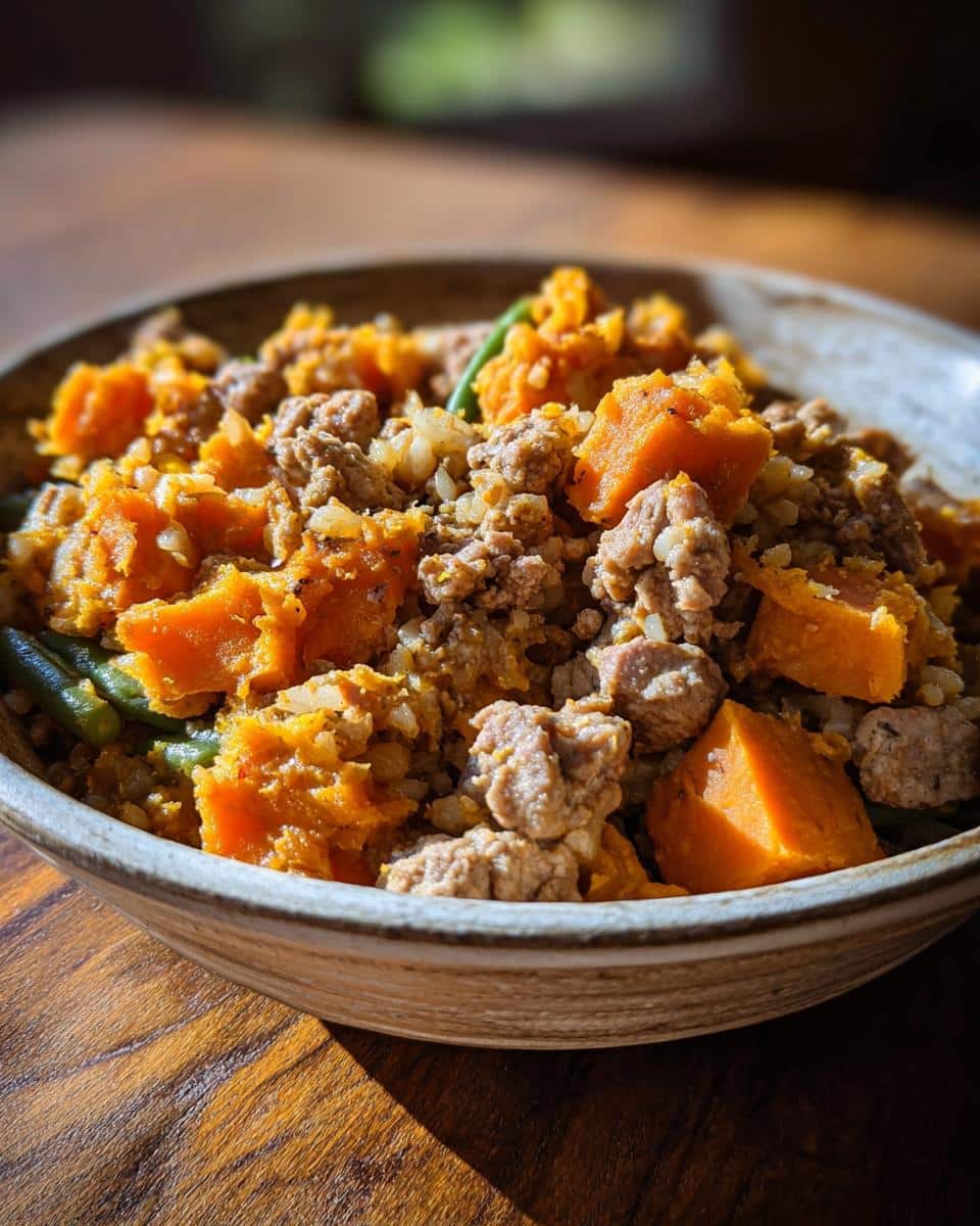 A close-up of Turkey & Sweet Potato Mini-Batch Dog Food with ground turkey, sweet potato chunks, rice, and green beans in a bowl.