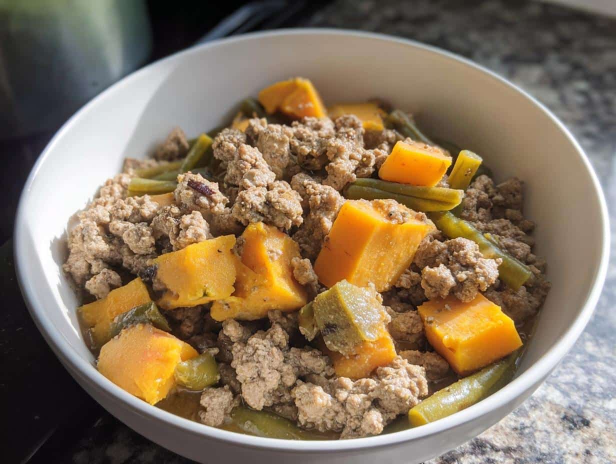 A bowl of Turkey-Free Holiday Dog Stew featuring ground meat, bright orange sweet potato chunks, and green beans.