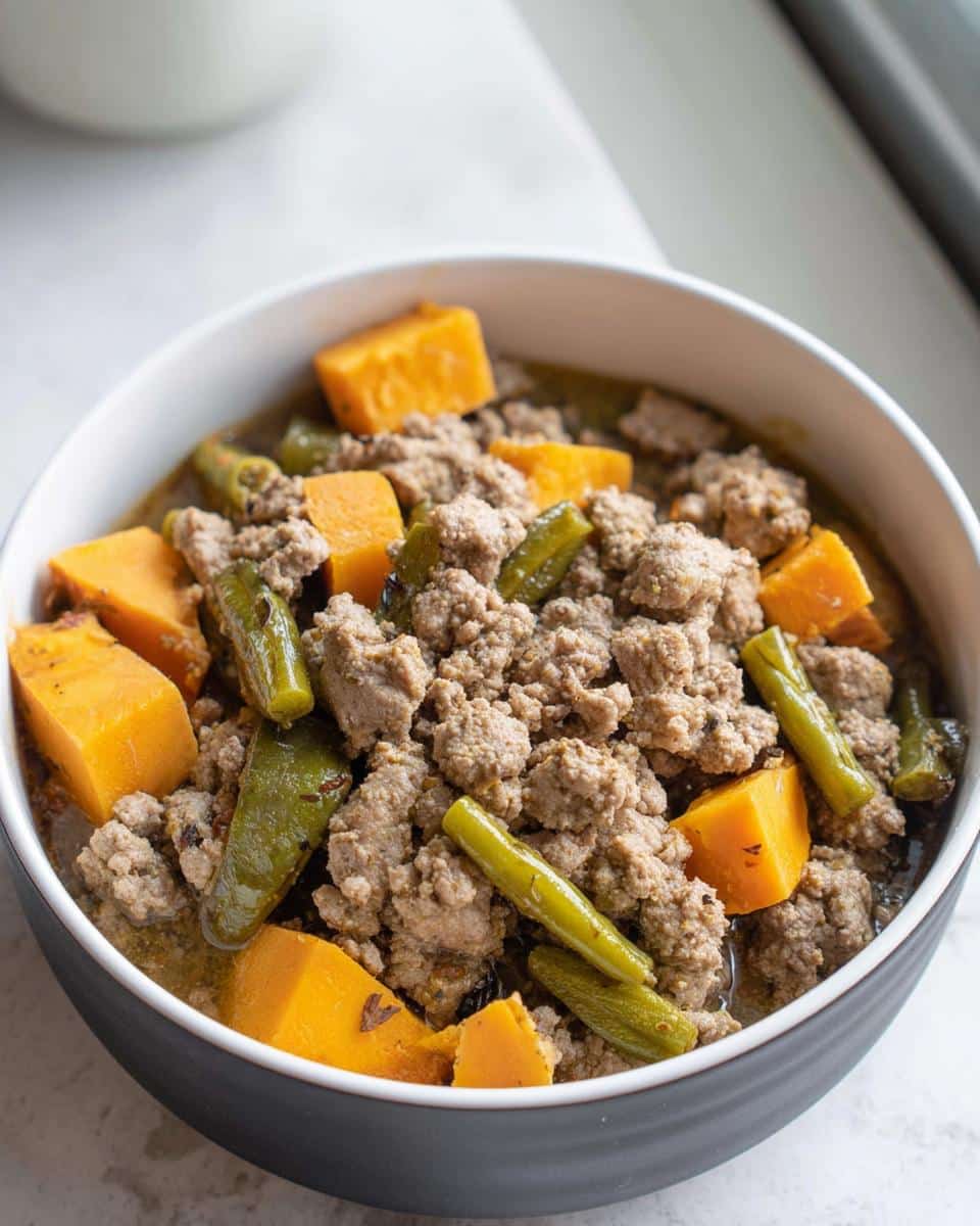 Close-up of Turkey-Free Holiday Dog Stew featuring ground meat, orange sweet potato chunks, and green beans in a white bowl.