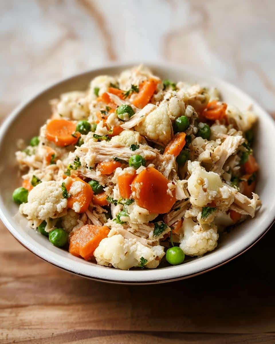 Close-up of homemade dog food featuring shredded meat, cauliflower florets, carrots, and peas.