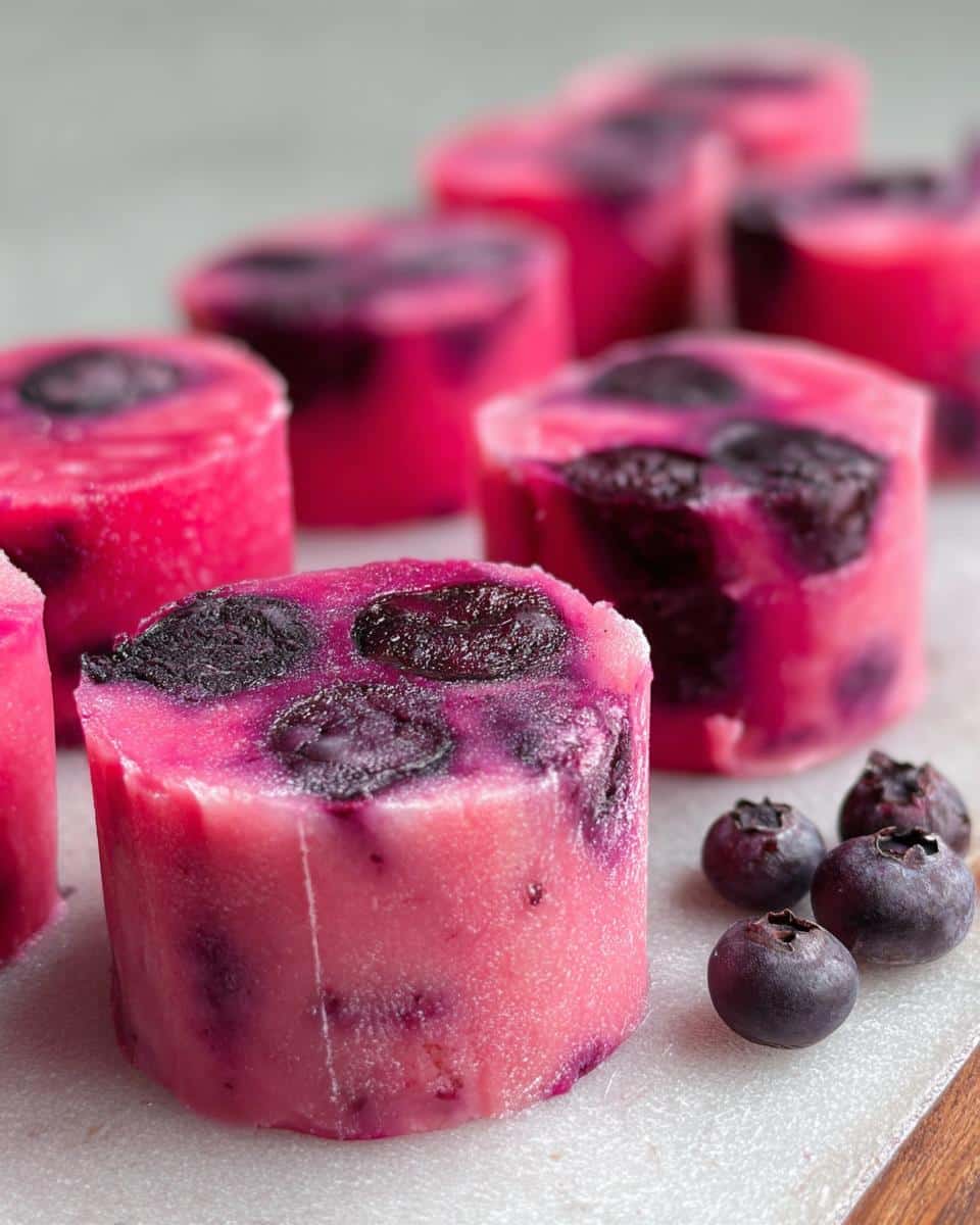 Close-up of frozen Watermelon & Blueberry Swirl Bites For Dogs, showing pink and purple swirls with whole blueberries.